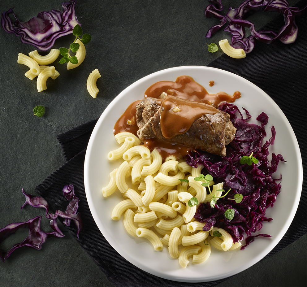 Rinderroulade in herzhafter Sauce mit Nudeln und Rotkohl